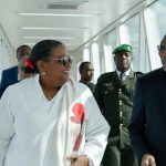 President David Granger yesterday afternoon received a courtesy call from the Prime Minister of Barbados, Mia Amor Mottley, at the Cheddi Jagan International Airport (CJIA), Timehri. According to the Ministry of the Presidency, Mottley made a brief visit to Guyana on her return to Barbados from the Republic of Ghana. She was welcomed by Granger, Minister of Foreign Affairs, Dr. Karen Cummings and other officials. Mottley was accompanied by Barbados’ Minister of Foreign Affairs, Dr. Jerome Walcott and other officials. In this Ministry of the Presidency photo, President David Granger and Prime Minister of Barbados, Mia Amor Mottley exchange pleasantries on her arrival at the Cheddi Jagan International Airport, Timehri.(Stabroek news)…[+]