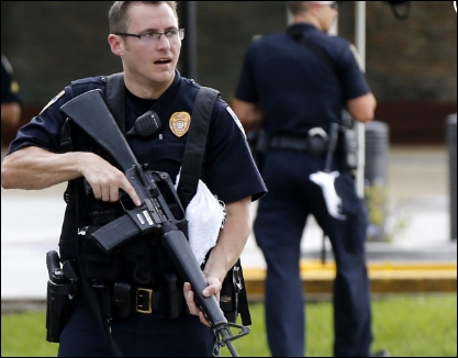 The shooting began around 9 a.m. when patrolling officers saw a “suspicious person walking down Airline Highway with an assault rifle,” officials said.