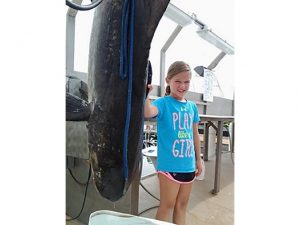 US – A 9-year-old girl has set a new state record by reeling in a massive 94.6-pound fish. It took 20 minutes for Emma Zajdel to bring in the record-breaking cobia that weighs more than she does, and towers over her at 66.5 inches long.