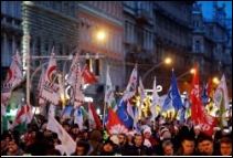 Braving sub-zero temperatures, setting off flares and waving Hungarian and European Union flags, about 10,000 demonstrators walked from historic Heroes’ Square towards parliament and then state TV in a march dubbed “Merry Xmas Mr. Prime Minister.” The march was largely peaceful until police fired tear gas at protesters jostling outside the TV station late at night. Footage showed people crouching and blinded by the gas.