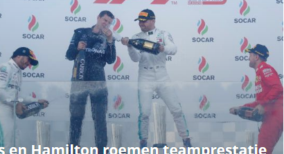 Winnaar Valtteri Bottas en nummer twee Lewis Hamilton waren zondag in Azerbeidzjan vol lof over hun team Mercedes. Voor het eerst in de geschiedenis van de Formule 1 pakte een team een één-twee bij de eerste vier Grands Prix van het seizoen. “Deze overwinning betekent heel veel voor me”, was de eerste reactie van Bottas na de race. “Het hele team verricht geweldig werk en iedereen presteert top.”