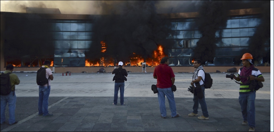 MEXICO – Actievoerders hebben in de Mexicaanse deelstaat Guerrero woensdag het regioparlement in brand gestoken. Boze Mexicanen waren de straat opgegaan naar aanleiding van de verdwijning van en waarschijnlijke moord op 43 studenten. Buiten het lokale parlementsgebouw gingen in provinciehoofdstad Chilpancingo auto’s in vlammen op. Eerder raakten demonstranten er al slaags met de politie. Ze gooiden dinsdag stenen en vuurwerk naar de agenten…[+]