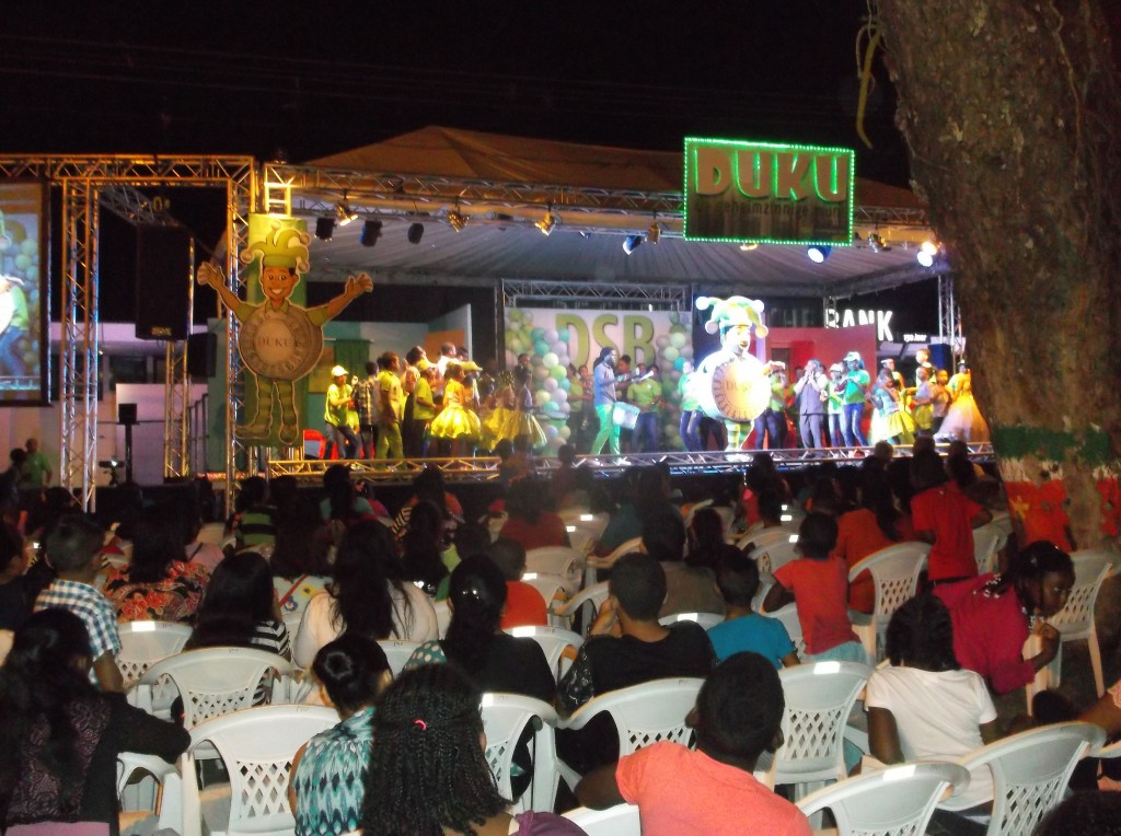 NICKERIE – Even leek het erop dat de regen de grote spelbreker zou zijn tijdens de voorstelling van de kindermusical Duku, de geheimzinnige munt, vrijdagavond in Nickerie. Speciaal voor die gelegenheid was de parkeerplaats van De Surinaamsche Bank (DSB) Nickerie aan de Landingstraat omgetoverd tot een straattheater. Niets heeft echter de pret mogen drukken, want ongeveer een uur voor het straattheater zou aanvangen, stopte het met regenen en was het mooi weer. Jong en oud waren aanwezig om van de musical te genieten. Duku is de mascotte van DSB. Hij is een geheimzinnige munt, die normen en waarden overbrengt en heeft ook verschillende principes zoals, je mag niet stelen, kinderen moeten hun best doen, goed luisteren en eerlijk zijn. DSB-directeur Siegmund Proeve noemt de voorstelling in Nickerie geslaagd. Hij schat dat ongeveer 1500 mensen aanwezig waren om het theaterstuk te aanschouwen…[+]