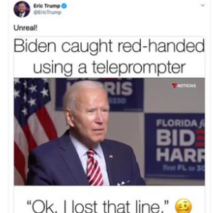 The US president’s son, Eric Trump, has tweeted a video that falsely claims Democratic candidate Joe Biden used a teleprompter to help him answer questions in a television interview. Eric Trump wrote “Unreal”, above a 26-second video with the headline: ‘Biden caught red-handed using a teleprompter’. Telemundo, which broadcast the interview, said the claims were false and that it “has never allowed someone who is being interviewed on its news programmes to read answers from a teleprompter”.(BBC)…[+]
