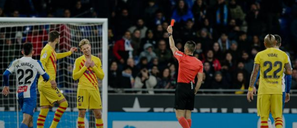 Frenkie de Jong heeft zaterdag voor het eerst in zijn profcarrière een rode kaart gekregen. Met tien man verspeelde FC Barcelona vervolgens twee punten in de derby op bezoek bij Espanyol: 2-2. De Jong kreeg in het RCDE Stadium in een tijdsbestek van negen minuten twee keer geel. In de 66e minuut werd de Nederlander door scheidsrechter Carlos Del Cerro Grande bestraft voor een overtreding op Matias Vargas en in de 75e minuut moest hij vertrekken na vasthouden van Jonathan Calleri.
