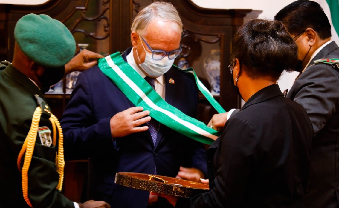 Franse ambassadeur onderscheiden met Grootlint in de Ere-Orde van de Palm