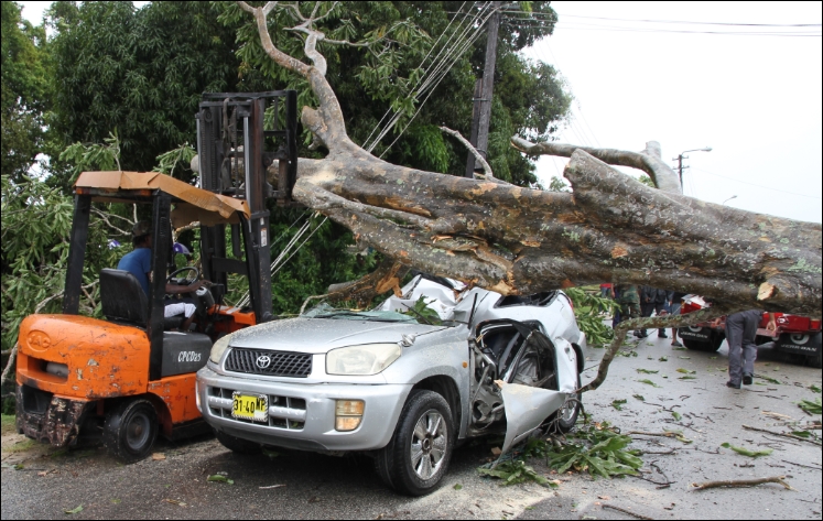 Heavy weather that was caused by a frontal depression that passed  Suriname’s coastal area left 1 person dead, zinc sheets on the streets or in trees or power lines, trees uprooted, billboards and utility poles broken on Sunday morning. A man who was driving along the Ringweg drove into the gutter after he saw a billboard being pressed to the ground by the forces of nature. Trees also flattened cars at Witsantie and  Sabakoe. Reports indicate that 51-year-old AR died when a tree fell on his car…[+]