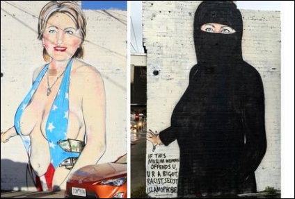 MELBOURNE – Hillary Clinton begon in bikini, kreeg daarna een nikab maar werd uiteindelijk met zwarte verf weggeschilderd. Het gaat over een omstreden muurschildering op de zijkant van een scooterwinkel van de kunstenaar Lushsux in de Australische stad Melbourne. De artiest beeldde de Democratische presidentskandidaat in eerste instantie af in een stars-and-stripes bikini inclusief een opdringerige, met honderd dollarbiljetten gevulde buste. Maar daar kwam een serie klachten over vanuit de bevolking, waarna de gemeente de kunstenaar opdroeg de muurschildering te verwijderen op straffe van een boete.(Telegraaf)…[+]