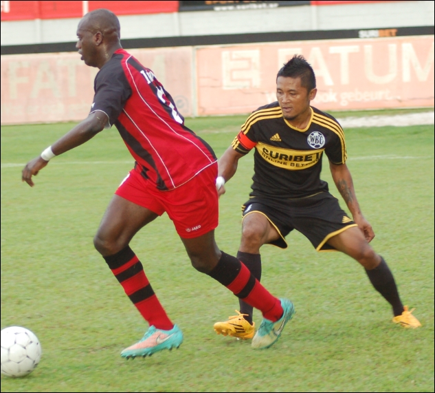 VOETBAL – Inter Moengo Tapoe (IMT) heeft nog tien punten nodig om het kampioenschap te prolongeren in de hoofdklasse van de Surinaamse Voetbal Bond. Zondag won het team in het André Kamperveenstadion eenvoudig van Walking Boyz Company (WBC) met 3-1. IMT begon de wedstrijd goed en creëerde vanaf het begin goede kansen. WBC speelde vooral in de eerste helft een slechte wedstrijd. Trainer Hesron Jeroe van IMT liet zijn jongens steeds naar voren gaan en dit gaf WBC veel problemen. Zo maakte de verdediging tal van fouten, maar werd in eerste instantie geholpen door het nonchalante spel van IMT…[+]