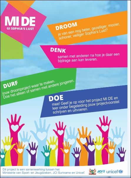 Aan het eind wordt er een selectie gemaakt van jongeren met een idee om hun leefomgeving te verbeteren en de ontwikkeling van de jongeren van de buurt de stimuleren. De geslecteerde jongeren krijgen de training en coaching van de Junior Chamber Suriname (JCI). Dit project is een initiatief van het Directoraat Jeugdzaken van het Ministerie van Sport- en Jeugdzaken. Jongeren tussen 10 en 24 jaar uit Sophia’s lust mogen met een idee over bijvoorbeeld het milieu, nuttige vrije tijdsbesteding en veiligheid deelnemen aan dit project. Opgave voor deelname kan vanaf dinsdag 29 maart tot en met 3 april 2016 via facebook en op het nummer 8813302…[+]