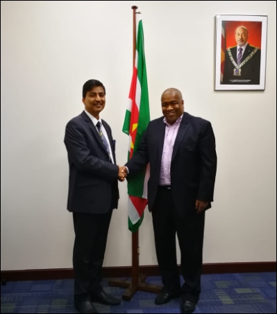 PARAMARIBO- De minister van Financiën Gillmore Hoefdraad, heeft de recent aangestelde Indiase ambassadeur Z.E. Mahender Singh Kanyal ontvangen voor een kennismaking. Dit gebeurde op 29 augustus.