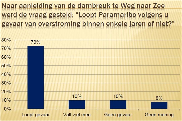 PARAMARIBO – Volgens de kiesgerechtigden van Paramaribo loopt de hoofdstad gevaar van overstroming binnen enkele jaren. Dit heeft een onderzoek van het ngo, Instituut voor Kaderontwikkeling en Onderzoek in Suriname (NIKOS) uitgewezen. Naar aanleiding van de dambreuk in Weg naar Zee is aan 777 respondenten de vraag gesteld of Paramaribo volgens hun gevaar loopt van een overstroming binnen enkele jaren…[+]