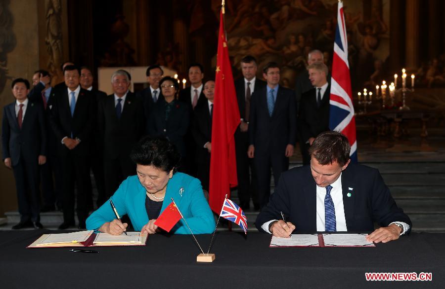 CHINA-Chinese Vice Premier Liu Yandong (L) and British Health Secretary Jeremy Hunt (R) sign the joint declaration of the third meeting of the China-Britain high-level cultural exchange mechanism in London, Britain, on Sept. 17, 2015. Liu Yandong and Jeremy Hunt on Thursday co-chaired the meeting. (Xinhua/Han Yan) (Xinhua/Han Yan) Chinese Vice Premier Liu Yandong (L) shakes hands with British Health Secretary Jeremy Hunt during the third meeting of the China-Britain high-level cultural exchange mechanism in London, Britain, on Sept. 17, 2015. Liu Yandong and Jeremy Hunt on Thursday co-chaired the meeting. (Xinhua)…[+]