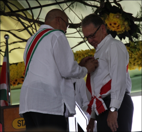 PARAMARIBO – Algemeen directeur Marc Waaldijk van Staatsolie is zaterdag bij de officiĆ«le uitbreiding van de raffinaderij gedecoreerd door president Desi Bouterse. Waaldijk kreeg de hoogste onderscheiding. Hij werd benoemd tot drager van het Groot Lint in de Ere Orde van de Gele Ster. De president die de aanwezigen toesprak op de 34ste verjaardag van het staatsbedrijf, onderbrak zijn speech om zich even terug te trekken. Een deel van de aanwezigen keek verbaasd toen het staatshoofd wegliep, terwijl een ander deel zat te vermoeden wat de president van plan was te doen...[+]