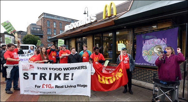 McDonald’s workers in Britain are striking in a dispute over zero-hours contracts and working conditions that is being closely observed by the fast food industry and trade unions. Staff from branches in Manchester and Watford will join colleagues in Crayford and Cambridge as part of a “McStrike” as workers demand a minimum £10-an-hour living wage.