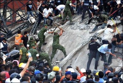 MEXICO-STAD – De reddingswerkzaamheden na de zware aardbeving dinsdag in Mexico zijn ook in de nachtelijke uren met man en macht doorgegaan. De directeur van de dienst bescherming bevolking maakte woensdag in de vroege ochtend bekend dat er 216 slachtoffers zijn geborgen. De minister van Binnenlandse Zaken Miguel Ángel Osorio Chong sprak eerder van zeker 224 doden. Volgens hulpverleners ging het onder meer om zeker 32 kinderen. Deze werden uit een ingestorte school in Mexico-Stad gehaald, evenals de lichamen van vijf volwassenen.  Tientallen leerlingen worden nog vermist. Er zitten naar schatting nog zo’n dertig tot veertig mensen vast in het ingestorte schoolpand. „We horen stemmen, dus er zijn nog mensen in leven”, zei een woordvoerder van de marine tegen televisiezender Televisa. Tot dusver zijn elf leerlingen levend uit het gebouw gehaald.(Telegraaf)…[+]