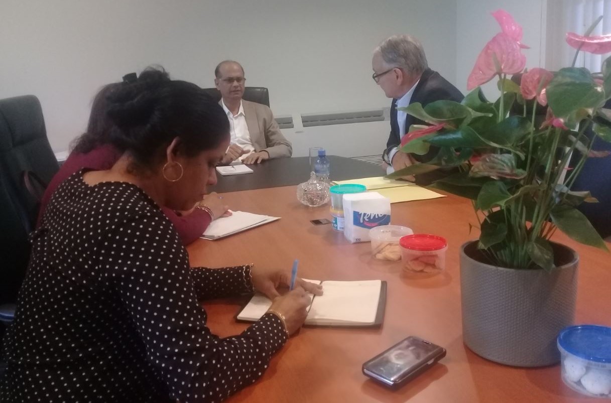 Minister Rabin Parmessar van het ministerie van Landbouw, Veeteelt en Visserij (LVV), heeft de Residerende Ambassadeur van Frankrijk, Antoine Joly, uitgenodigd voor een gesprek inzake de exportmogelijkheden van Suriname naar Europa. Tijdens dit gesprek zijn de mogelijkheden besproken over hoe dit zo snel als mogelijk georganiseerd kan worden. De Ambassadeur heeft dit gesprek verwelkomt en heeft daarbij van de gelegenheid gebruikt gemaakt om enkele documenten te overhandigen aan de bewindsman. Deze documenten bevatten de exportregels van goederen die wel en of niet mogen worden geëxporteerd. Tijdens dit bezoek welke op vrijdag 1 november 2019 plaats vond op het ministerie waren ook enkele stafleden van LVV aanwezig.