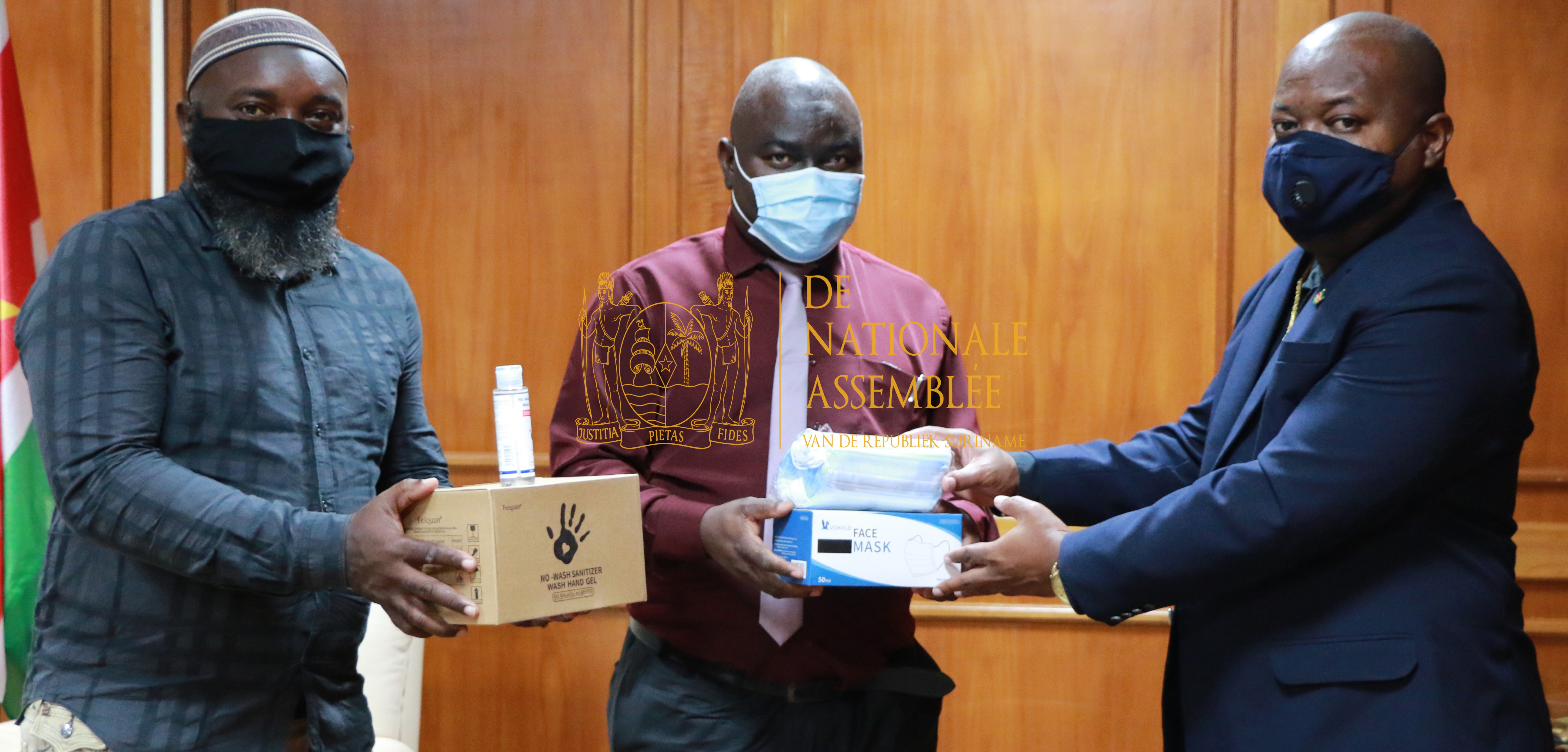 Parlementsvoorzitter Marinus Bee MSc. LL.B heeft op maandag 27 juli 2020 een donatie in ontvangst genomen van binnenlandse ondernemers. De heren Waldi Aloeboetoe van Jurterlinta Ahad NV en Paul Abiteng van Suriwood Masters NV hebben honderd handsanitizers en duizenden mondkapjes geschonken aan het hoogste orgaan van staat. De schenking bestaat ook uit een grote printer van het merk Canon en twee laptops.