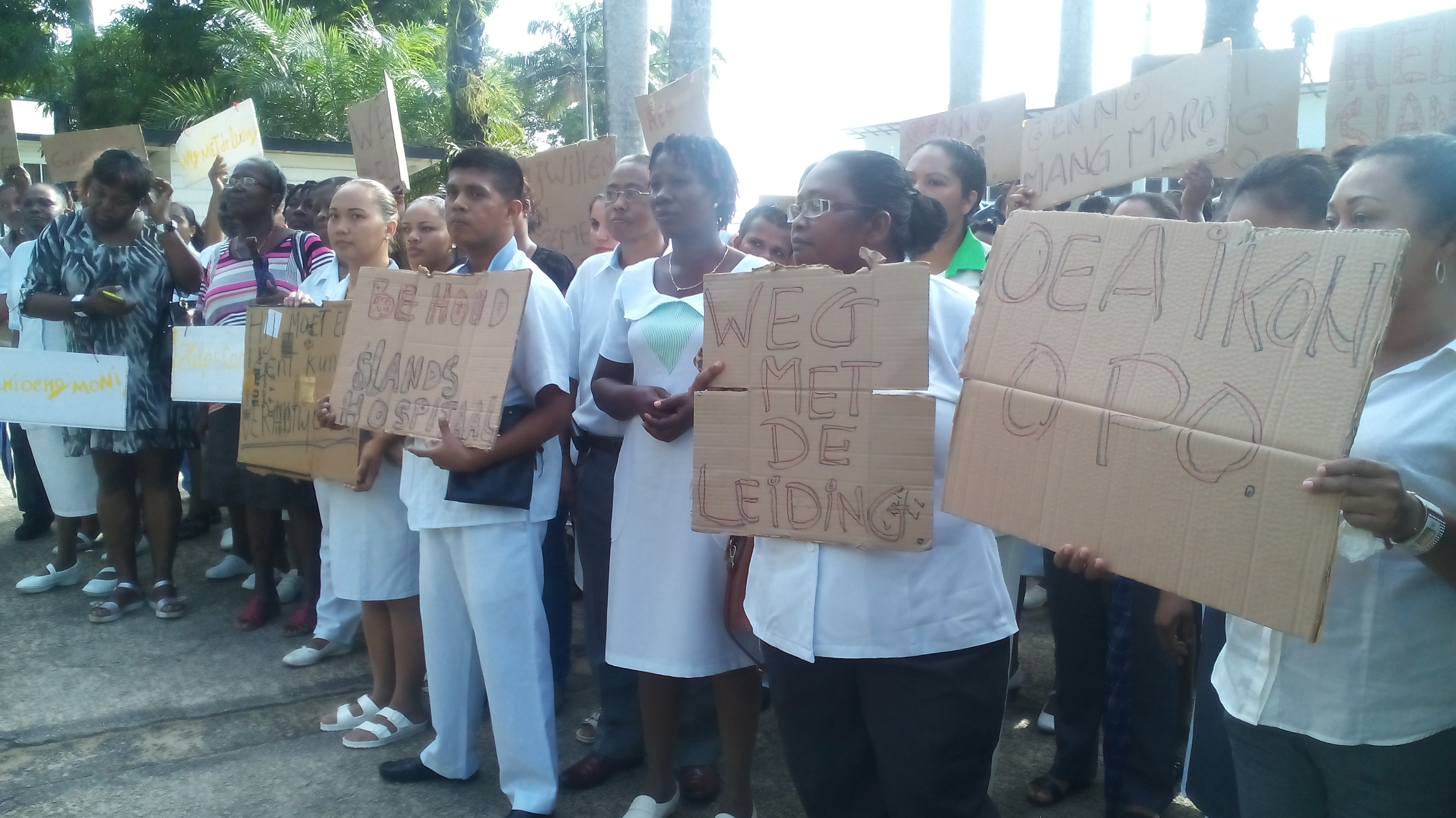 PARAMARIBO – Het stakende personeel van het ’s Lands Hospitaal is vandaag weer normaal aan het werk. Gisteren heeft de Bond van Personeel ‘s Lands Hospitaal (BPLH) een petitie overhandigd aan Eugene van der San, directeur Bestuurs- en Administratieve Aangelegenheden op het Kabinet van de President. Hij zal de petitie doorgeleiden naar president Desi Bouterse. Met leuzen en borden is een deel van het personeel getogen naar het Kabinet van de President waar het aandacht vroeg voor zijn probleem. Het personeel vraagt om vervanging van de huidige directie vanwege mismanagement.