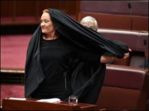 CANBERRA – In een poging een verbod ingevoerd te krijgen op de boerka, heeft een extreemrechtse Australische politica donderdag zelf een boerka aangetrokken en is ermee naar het parlement gegaan. De Australische regering en moslims hebben de actie van senator Pauline Hanson van de partij One Nation veroordeeld.Hanson zat gedurende twintig minuten in de vergaderzaal voordat ze de boerka uitdeed om vervolgens een verbod op het dragen van boerka’s in het openbaar te eisen. ,,Ik ben blij dat ik dit ding uit kan doen want dit hoort niet in dit parlement”, aldus Hanson. ,,Als een persoon een bivakmuts of een helm draagt en een bank en ieder ander gebouw binnen wil gaan, moet hij deze afdoen. Waarom is dat niet het geval voor iemand die haar gezicht bedekt en niet geïdentificeerd kan worden?”(Telegraaf)…[+]