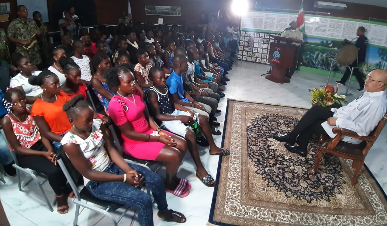 PARAMARIBO-In de Memre Buku Kazerne zíjn tieners die een bezoek brachten aan het Surinaams Leger Museum verrast geworden door een bezoek van president Desiré Bouterse. De president werd als “living legend” uitgenodigd door de legerleiding.
