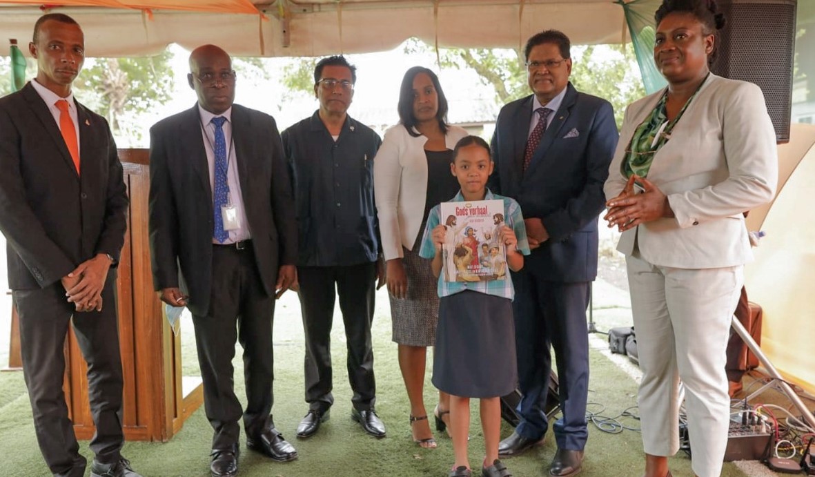 PARAMARIBO – “Lezen is weten”. In Suriname wordt jaarlijks op 4 maart de Nationale Voorleesdag gevierd. Op deze dag worden er op verschillende scholen speciale voorleesactiviteiten gehouden om het lezen bij jonge kinderen te stimuleren. In dit kader van heeft president Chandrikapersad Santokhi op maandag 7 maart een bezoek gebracht aan de Veritasschool. Bij deze gelegenheid las het staatshoofd een verhaal voor aan de leerlingen. President Santokhi werd vergezeld door minister Saskia Walden van Economische Zaken, Ondernemerschap en Technologische Innovatie (EZOTI) en zijn geestelijk adviseur, Harold Pultoo.