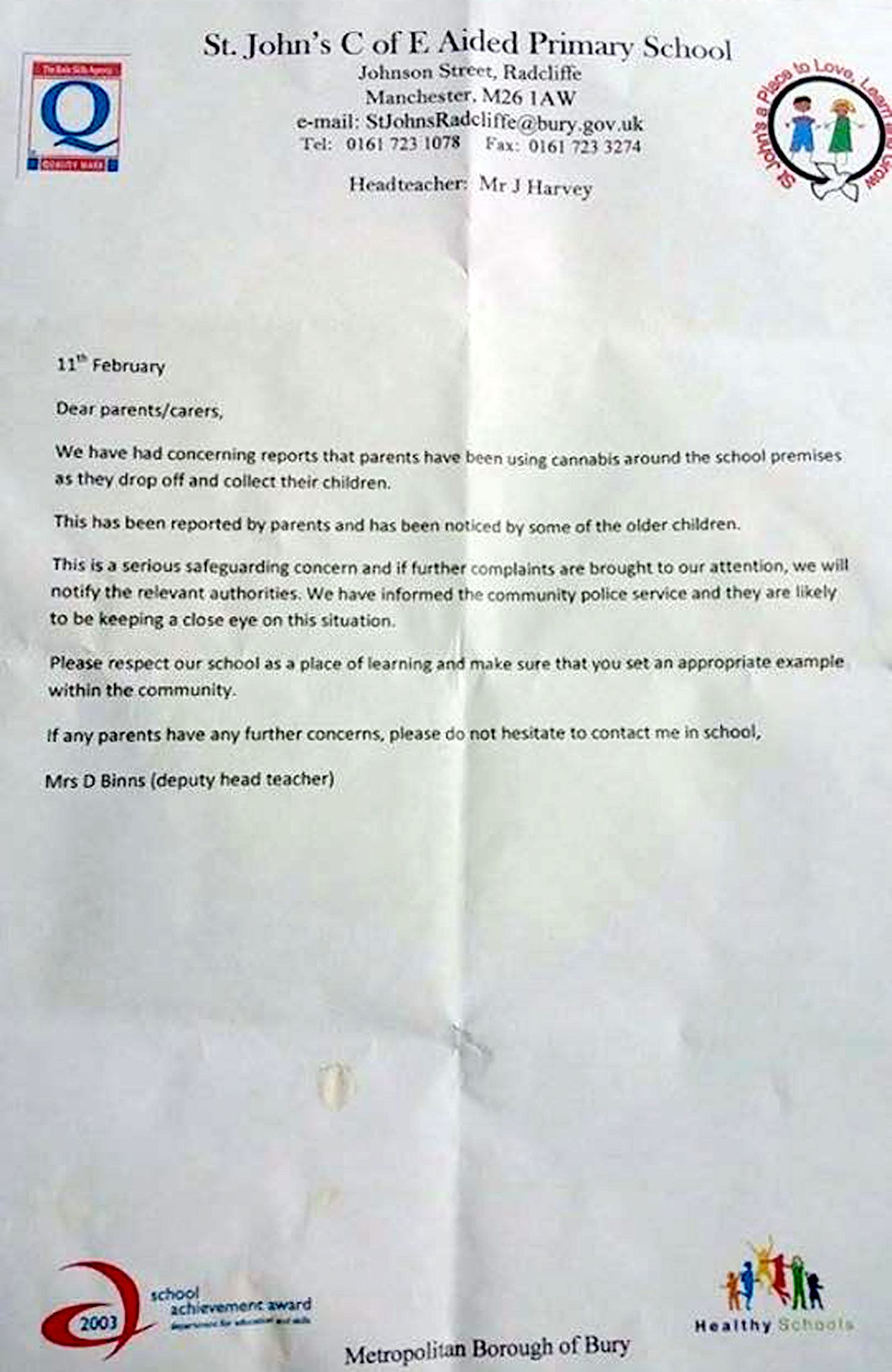 ENGLAND – A primary school has been forced to tell parents to stop smoking cannabis on the school run – while another is reminding parents not to use foul language when dropping off their children. Deputy head Deborah Binns wrote a strongly-worded letter after receiving ‘concerning reports’ that the substance was being smoked around St John’s Primary in Radcliffe, Greater Manchester.