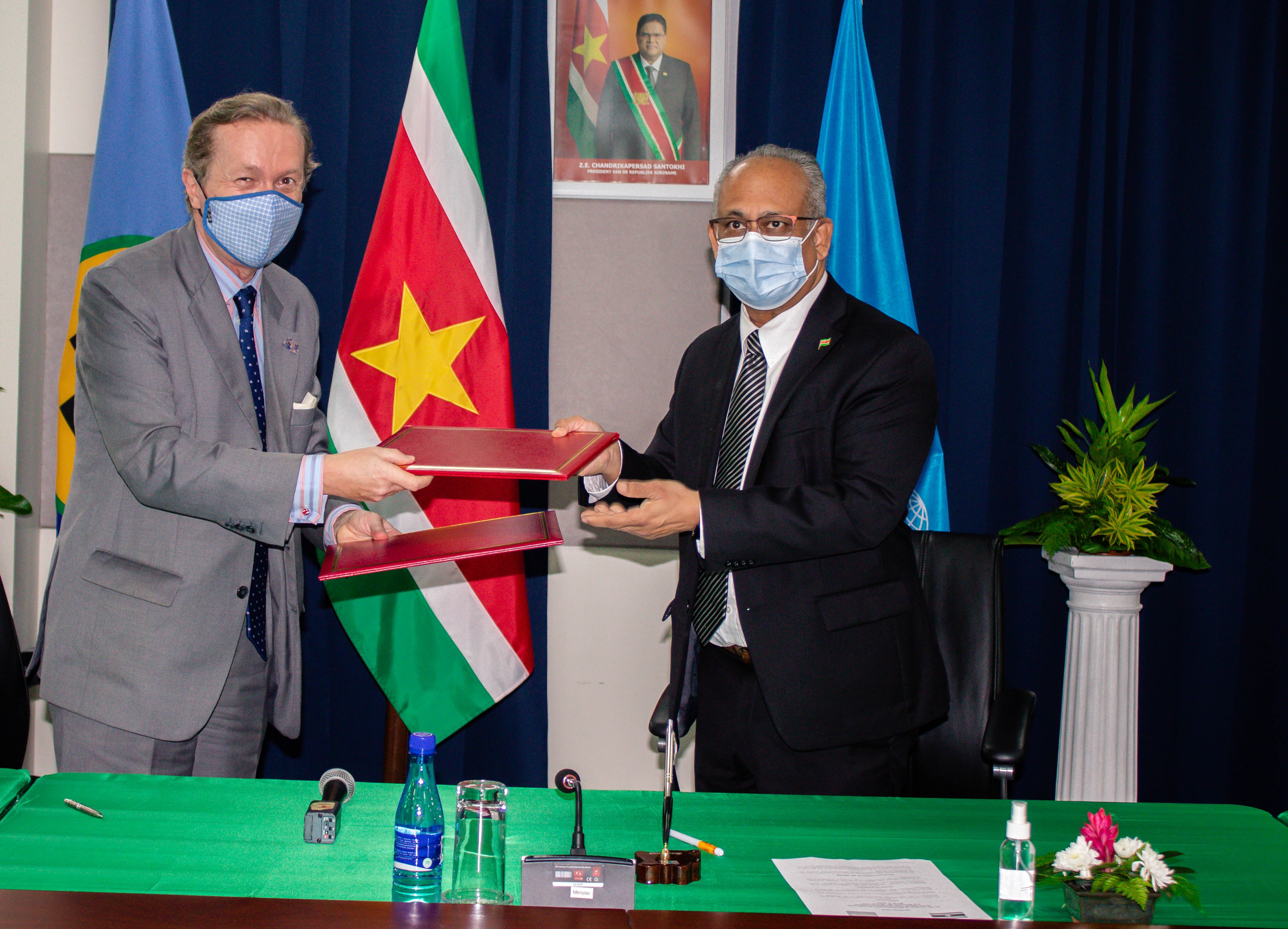 De regionaal vertegenwoordiger van de United Nations International Children’s Emergency Fund (UNICEF), Nicolas C. Pron, heeft zijn geloofsbrieven aangeboden aan minister Albert Ramdin van Buitenlandse Zaken, International Business en Internationale Samenwerking. Dit gebeurde op donderdag 4 maart 2021 ten kantore van de bewindsman. Nadat de geloofsbrieven zijn aangeboden, hebben minister Ramdin en de UNICEF-vertegenwoordiger het landenprogramma voor 2021 getekend. Minister Ramdin geeft aan, dat Pron als standplaats Georgetown, Guyana heeft. Het landenprogramma dat getekend is, behelst de uitvoering van een viertal projecten ten behoeve van het Surinaamse kind voor een bedrag van U$ 950.000. Volgens de bewindsman gaat het onder meer om de zorg van kinderen en de uitdagingen waarvoor ze staan. Minister Ramdin is blij, dat ondanks de COVID-19 periode, projecten zijn goedgekeurd in het belang van het kind waarbij de zorg een belangrijke rol speelt. In het kader van de pandemie zal via UNICEF ook worden gelet op de mentale gezondheid van kinderen…[+]