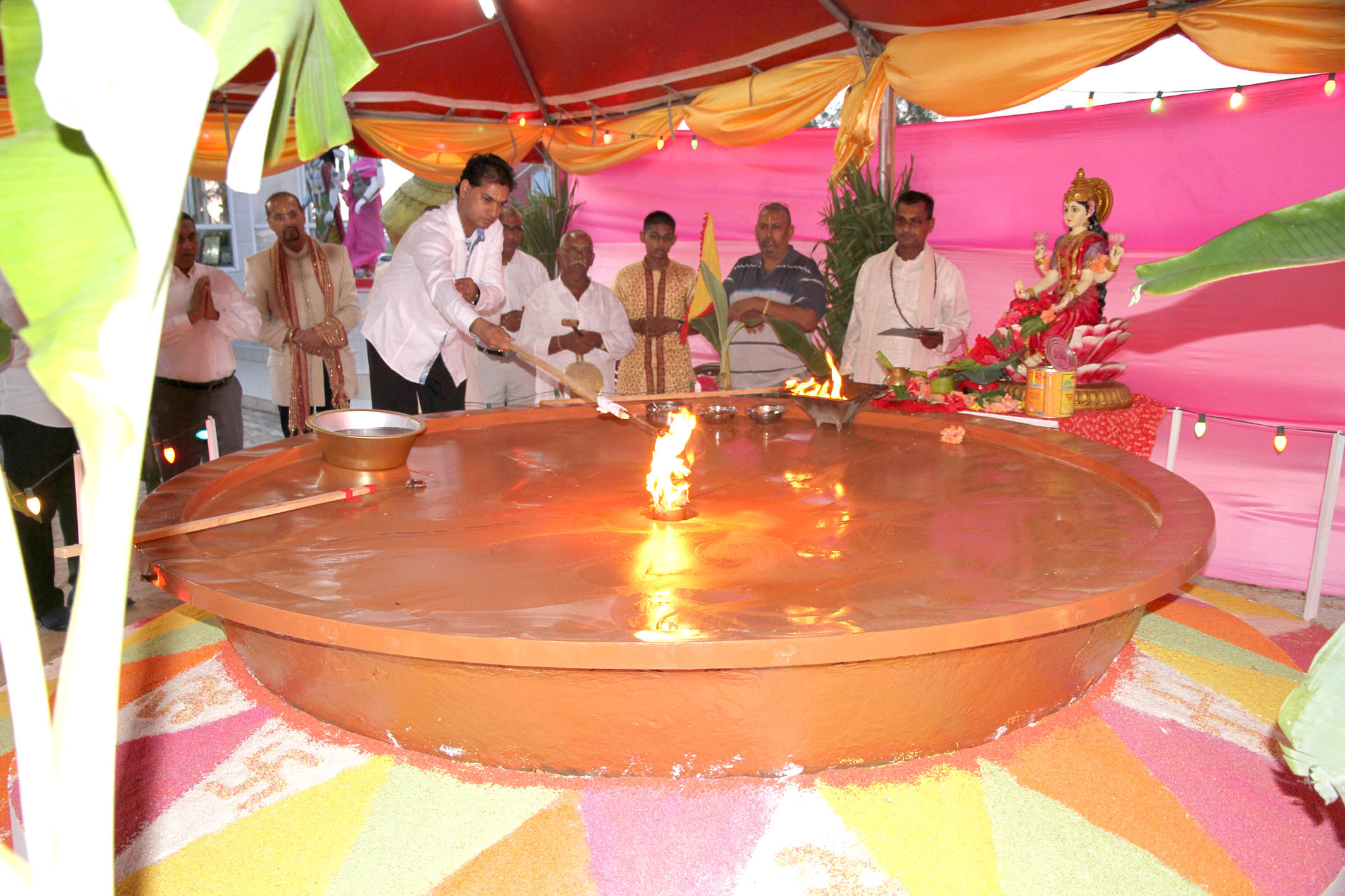 PARAMARIBO – De bewoners van Commewijne die graag ghee (een Indiaase klaargemaakte boter) in de reuzen Surinaamse dia willen doen, hoeven niet meer helemaal naar het Onafhankelijkheidsplein te gaan. Gisteren werd er bij het Tulsie Tiraath Ghaat bedevaartsoord dat is gevestigd op het terrein onder de Wijdenboschbrug te Meerzorg, een reuzendia aangemaakt. Soeresh Algoe, minister van Landbouw, Veeteelt en Visserij vertegenwoordigde de regering hier en deed ook ghee in de dia.