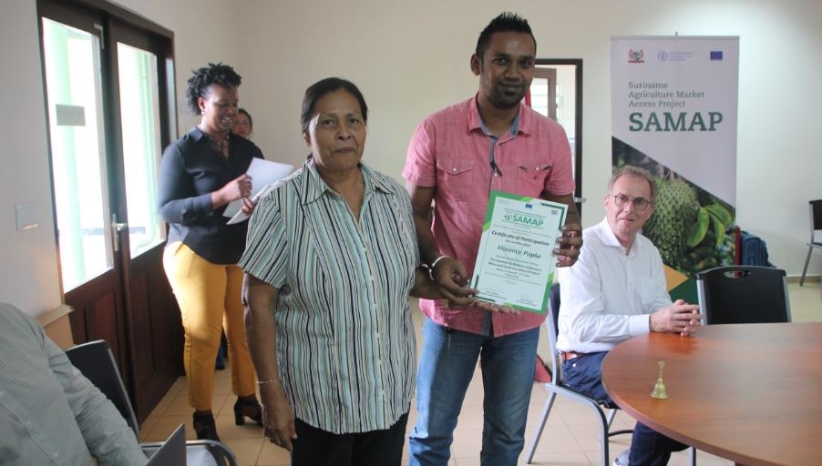 Het trainingsprogramma voor begeleiders van de SAMAP Matching Grant Facility (MGF) is afgesloten op het ministerie van Landbouw, Veeteelt en Visserij (LVV). Dit vond plaats op donderdag 17 oktober 2019, middels een certificaatuitreiking aan de 26 participanten. Gedurende 2 weken zijn vertegenwoordigers van de ministeries van LVV, Regionale Ontwikkeling (RO) en Handel, Industrie en Toerisme(HI&T), NGO’s, landbouwcoöperaties en diverse organisaties getraind in het begeleiden van boeren die in aanmerking willen komen voor een MGF-ondersteuning in de vorm van equipment.
