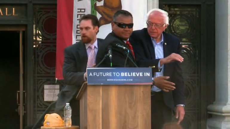 The Democratic presidential candidate was uninjured and continued speaking, but not before several agents hugged him and pushed him away from the microphone. The identities of the individuals, who yelled as they approached the stage, were not immediately known. They were apprehended and led away by Secret Service from the podium at the Frank Ogawa Plaza, where the rally was being held. After the events of Monday night in Northern California, Sanders spokesman Michael Briggs said, “It was handled professionally by the Secret Service.” An animal rights group, Direct Action Everywhere, claimed responsibility for the disruption in a press release.(CNN.COM /photo: cnn.com)…[+]