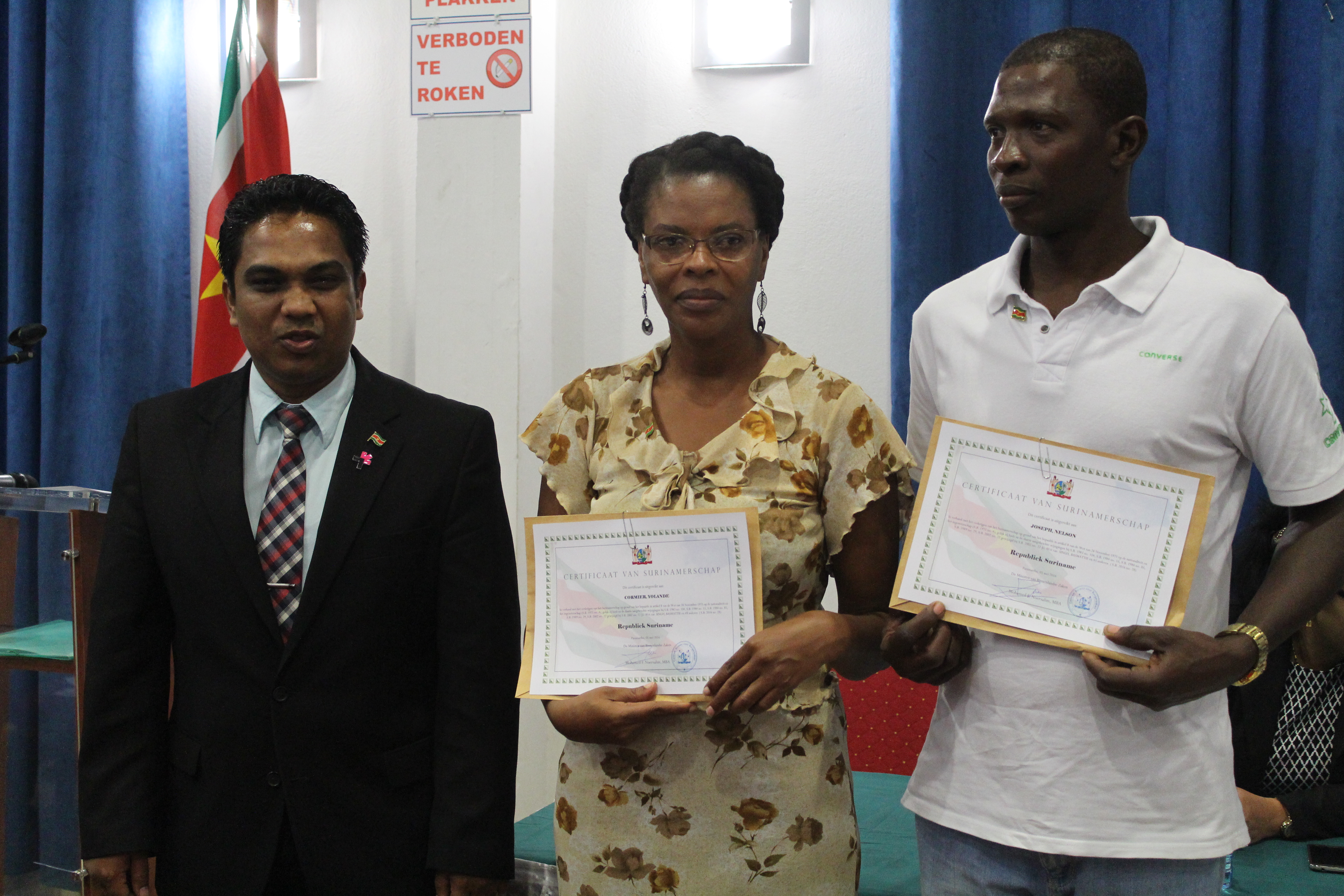 PARAMARIBO- PARAMARIBO-“U hoort nu tot het Surinaamse volk. Ik verwacht van u dat u met volle overtuiging deelneemt aan alle aspecten van onze samenleving. En een positieve bijdrage levert aan de verdere opbouw van uw nieuwe vaderland: Suriname.”. Zo sprak minister Mike Noersalim van Binnenlandse Zaken (Biza) de 96 “nieuwe” burgers toe bij de Naturaliseringsceremonie op 5 mei in het Lalla Rookh Gebouw.