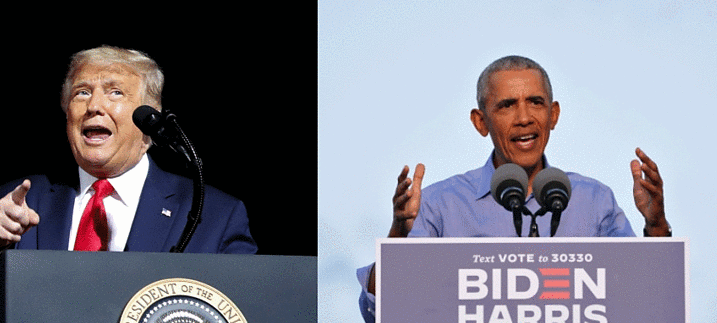 US President Donald Trump and his predecessor, Barack Obama, have directed blistering attacks at each other during rival rallies. Campaigning for Democratic White House nominee Joe Biden in Pennsylvania, Mr Obama likened Mr Trump to a “crazy uncle” and said he emboldened racists. In North Carolina, the Republican president mocked Mr Obama for being wrong about the 2016 election outcome. With 13 days to go until this election, Mr Biden holds a solid lead nationally. But the margin is slimmer in the handful of US states that could go either way and ultimately decide the outcome on 3 November.(BBC)…[+]