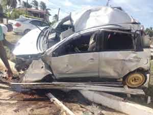 The police are investigating the cause of a horrific accident which claimed the lives of two persons on Tuesday morning on the No 46 Public Road, Corentyne. Three other persons, who were all said to be relatives have been hospitalized. They were all travelling in a motor car towards New Amsterdam when the accident occurred. According to information those dead are Paula Kissoondial 53, a mother of seven of Lot 128 Second Street, Swamp Section, Rose Hall Town and Akeem Harry 15, a labourer of Sookhoo Street, Rose Hall Town.(Kaieteurnews.com/photo:Kaieteurnews.com)…[+]