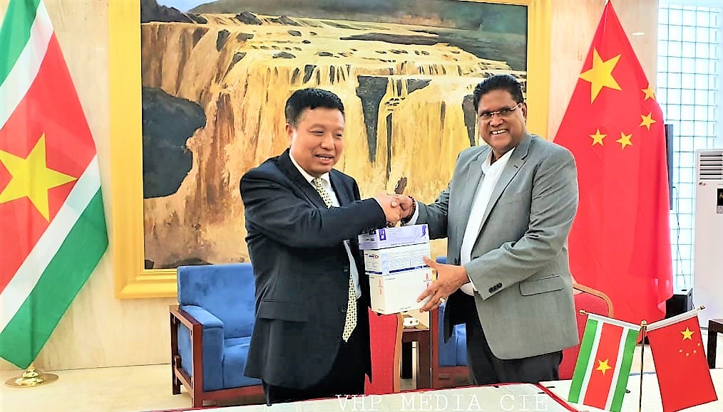 VHP voorzitter Chan Santokhi, heeft op maandagmiddag 10 februari, mondkapjes en handschoenen geschonken aan de ambassadeur van China, de heer Liu Quan. Er zijn veel mensen die we omschrijven als vriend, maar in nood leert men zijn echte vrienden kennen. Met deze woorden geschiedde de overdracht van een aantal mondkapjes en handschoenen aan de Chinese ambassadeur Liu Quan.