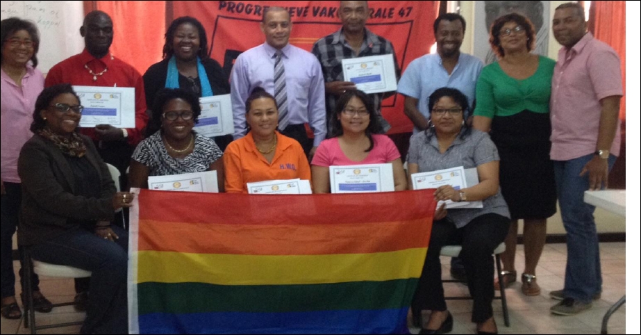 PARAMARIBO-De VSB en C-47 hebben op donderdag 22 en vrijdag 23 oktober gezamenlijk een LGBT sensitiviteitstraining verzorgd voor een aantal leden. De voorzitter van C-47, de heer Robby Berenstein en de Directeur van de VSB , de heer Steven Mac Andrew wezen beiden op donderdag 22 oktober tijdens de Opening Ceremony van de gezamenlijke sensiviteitstraining op de noodzaak om stigma en discriminering in de world of work uit te bannen. De Voorzitter van C-47 benadrukte eveneens, dat LGBT-ers, die al werkzaam zijn, moeten strijden voor hun rechten. De Directeur van de VSB gaf aan, dat werkgevers nimmer beschuldigd mogen worden van cherry picking van rechten en dus ervoor moeten zorgen, dat de rechten van anderen ook ondersteund en gewaarborgd worden.