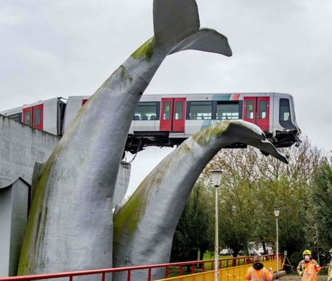 A train driver in the Netherlands has had a lucky escape thanks to a fortuitously placed art installation. A metro train in Spijkenisse, near the city of Rotterdam, crashed through a barrier at the end of the tracks shortly before midnight on Sunday. But rather than plummeting 10m (32ft) into the water below, the train was left suspended dramatically in the air. It ended up being delicately balanced on the large sculpture of a whale’s tail at the De Akkers metro station. “We are trying to decide how we can bring the train down in a careful and controlled manner,” one official told the Dutch national broadcaster NOS on Monday.(BBC)…[+]